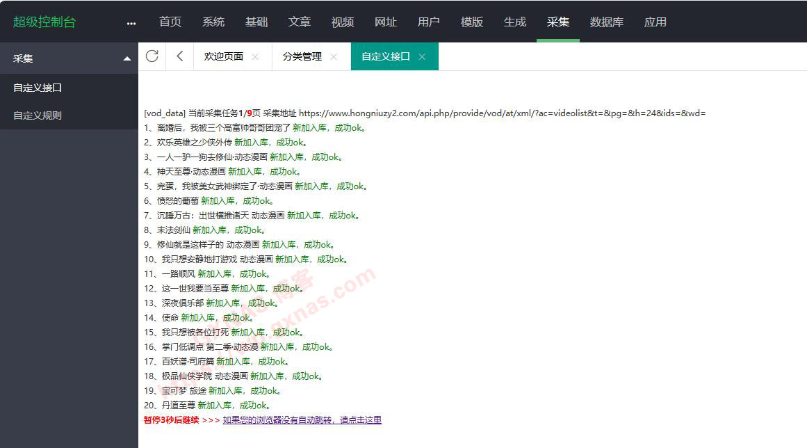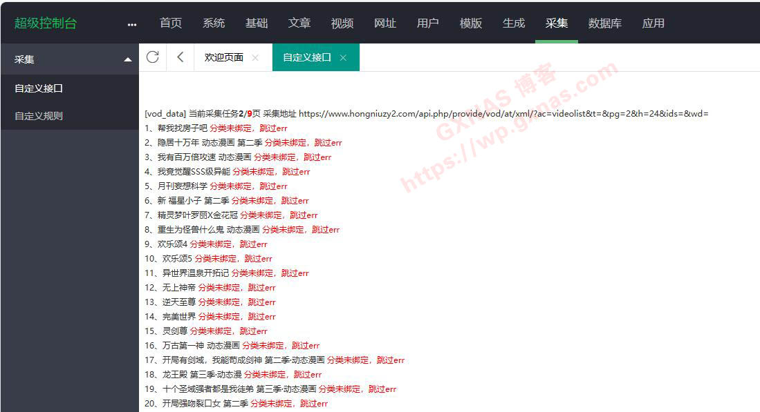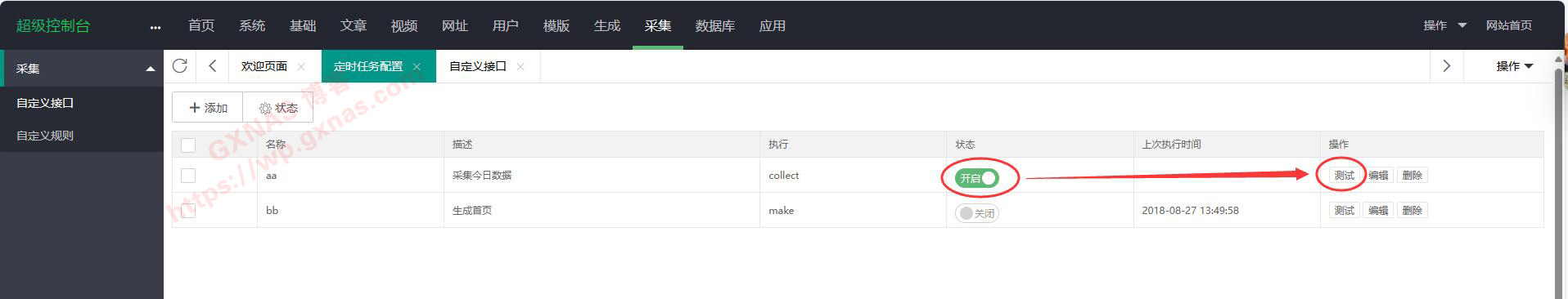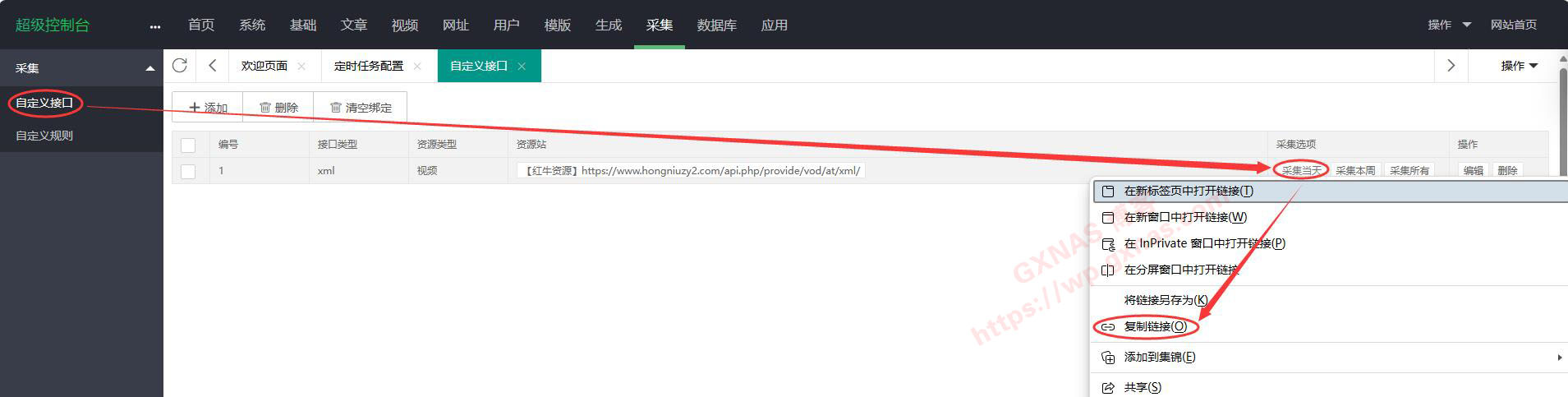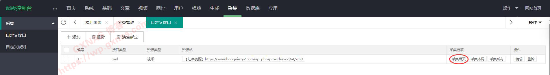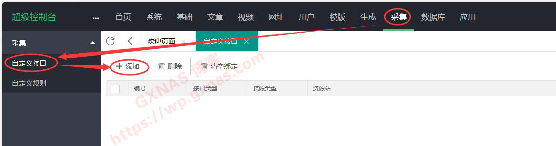 1、点菜单上“采集”,“自定义接口”,“添加”;