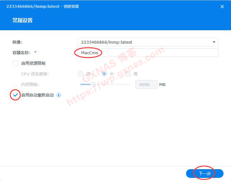 8、【使用docker-compose安装的,跳过此步骤】容器名称改成“MacCms”,在“启用自动重新启动”处打勾,下一步;