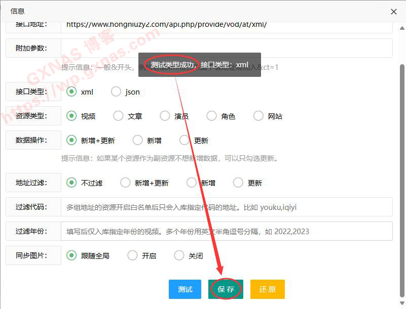 4、看到有信息提示“测试类型成功”就表示设置内容正确,点“保存”;
