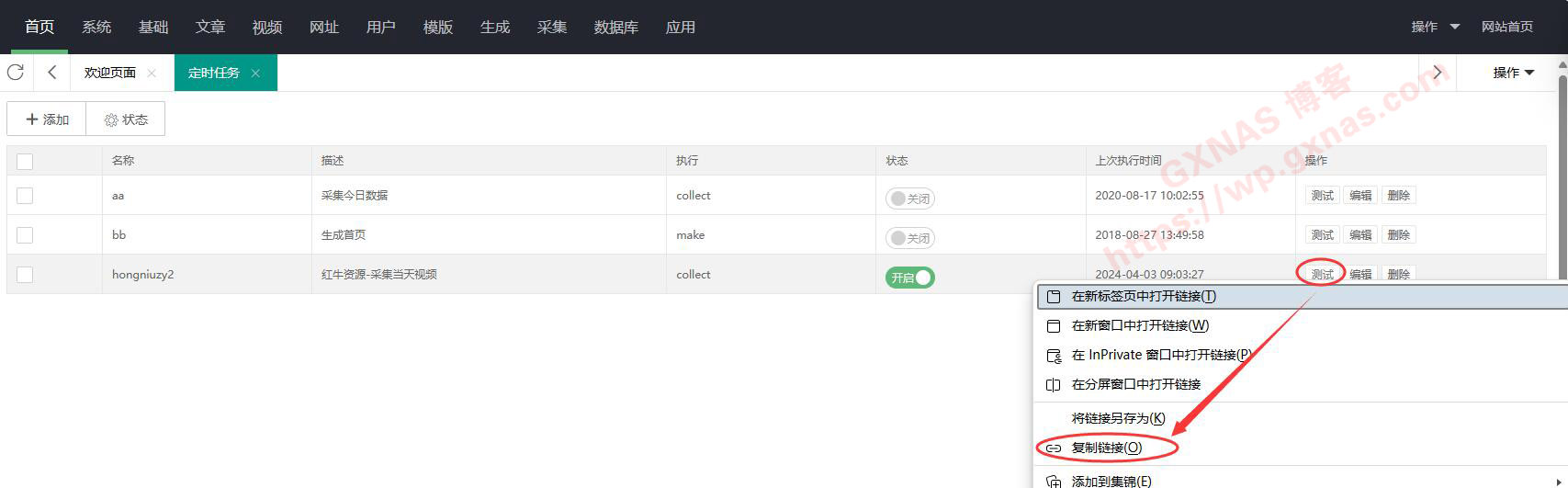 21、(2024年4月3日更新)由于MacCMS“定时配置任务”里面的脚本在规定的时间并不会自动执行,需要到群晖里面设置,在MacCMS“定时配置任务”里面找到前面设置的任务,在“测试”按钮上点右键,复制链接;