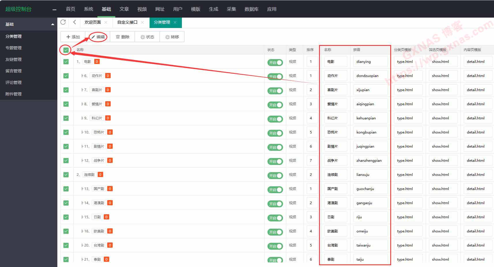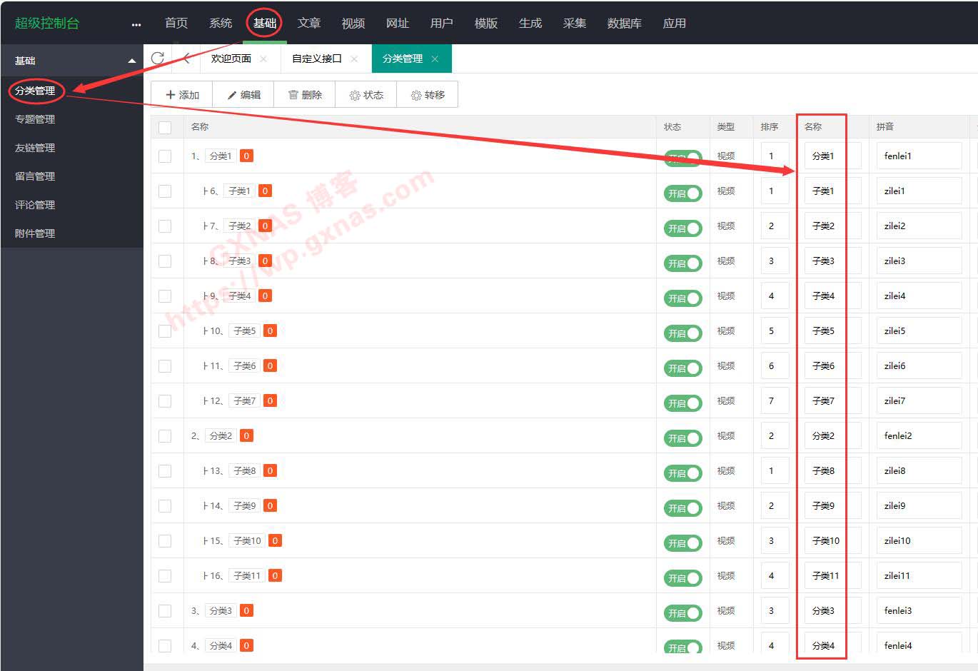 8、在浏览器新开一个网页标签,粘贴上一步骤复制的链接打开,点菜单上“基础”,“分类管理口”,找到“名称”这一列,根据上一个网页显示需要绑定的分类,去填写分类名称(注意有分类、子类的区别);