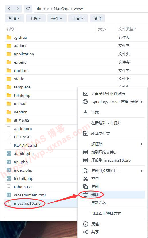 13、下载【maccms10.zip】到电脑,并上传到群晖docker/MacCms/www文件夹上;