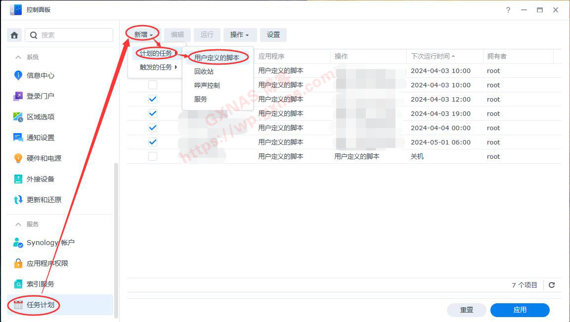 22、到群晖控制面板,任务计划,新增,计划的任务,用户定义的脚本;