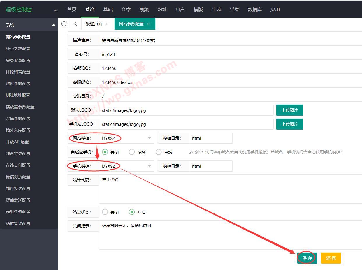 3、把网站模板和手机模板都改为“DYXS2”,其他的内容请按照自己实际情况进行设置,设置完成点“保存”;