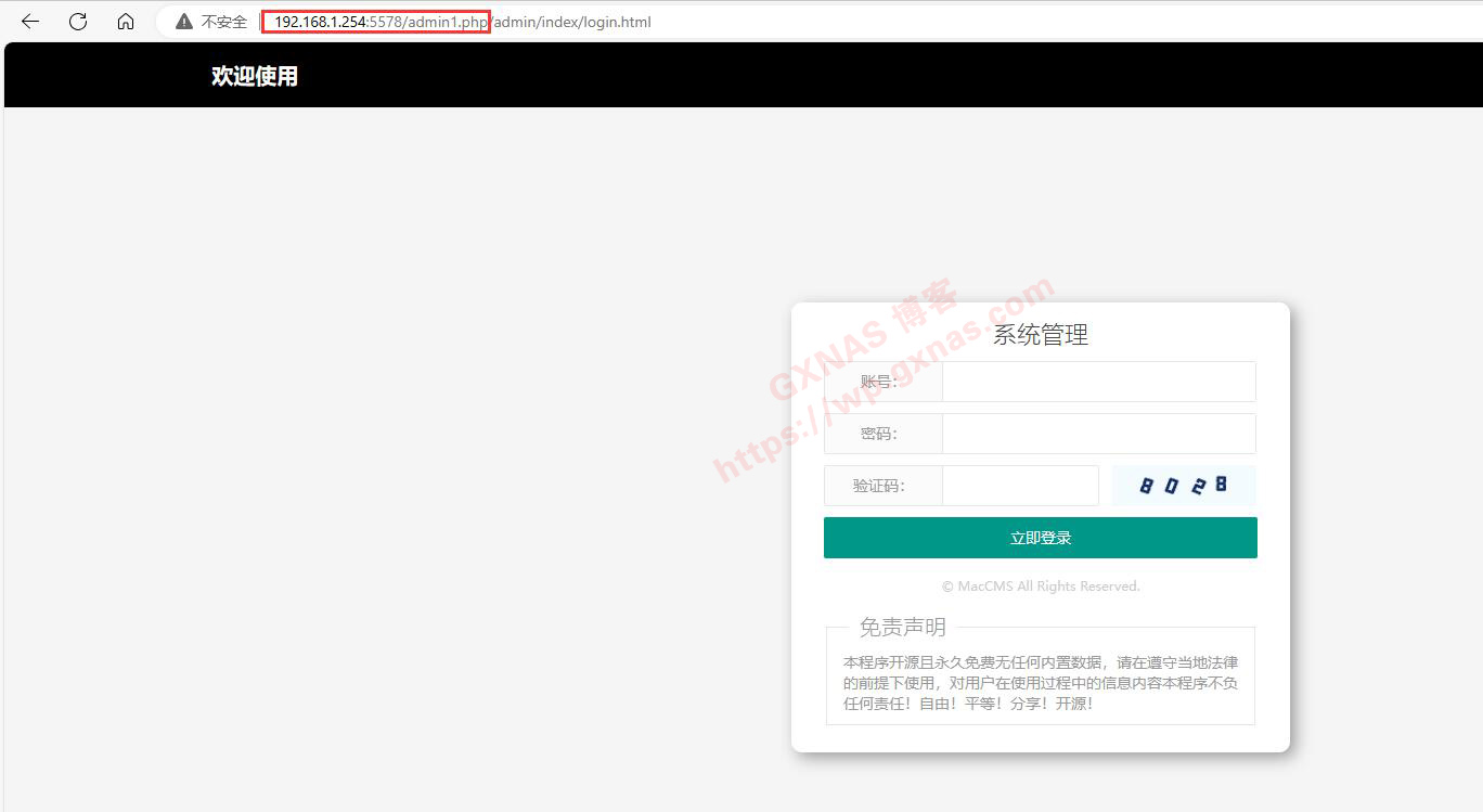 1、在浏览器打开http://群晖的IP:5578/后台管理入口.php,进入后台管理登录界面,输入在"三、群晖部署MacCMS步骤"第26个步骤填写的管理员账号、密码以及验证码,点“立即登录”;
