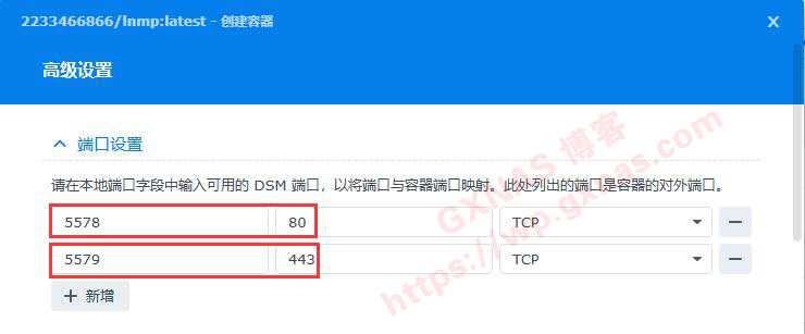 9、【使用docker-compose安装的,跳过此步骤】参考下图设置端口,左边的5578和5579如果有冲突可以随便改,右边的80和443必须如实写,不可以改;