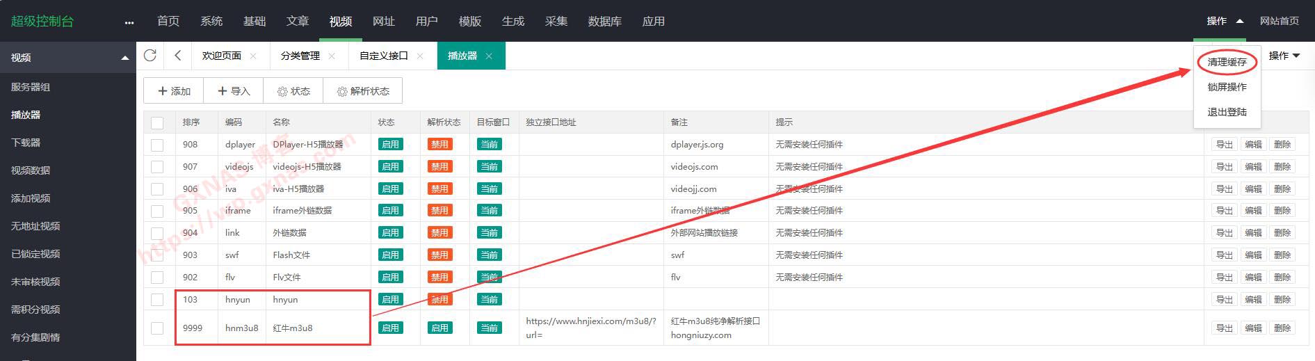 11、每次上传一个,直到两个播放器的文件全部上传完成(会看到有huyun和hnm3u8这两个编码),点“操作”菜单“清理缓存”;