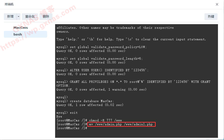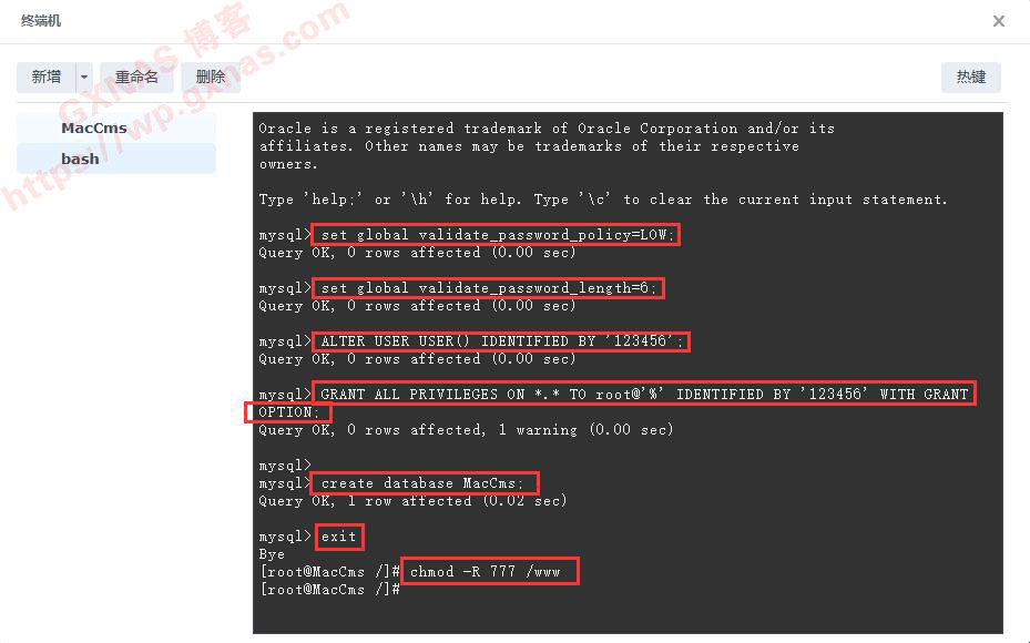 set global validate_password_policy=LOW;set global validate_password_length=6;ALTER USER USER() IDENTIFIED BY '123456';GRANT ALL PRIVILEGES ON *.* TO root@'%' IDENTIFIED BY '123456' WITH GRANT OPTION;create database MacCms;