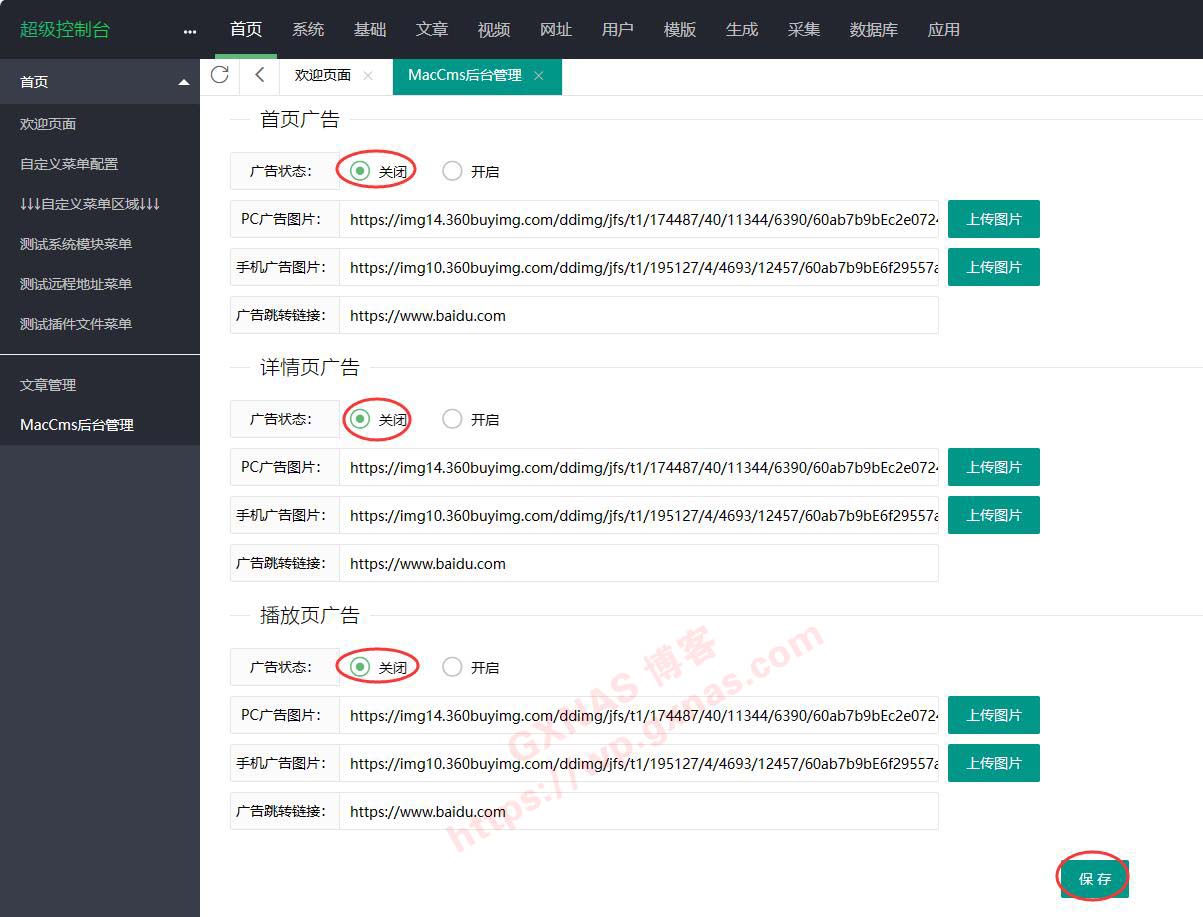 8、由于我这就只做测试,所以把三处广告设置全部调为关闭,保存;