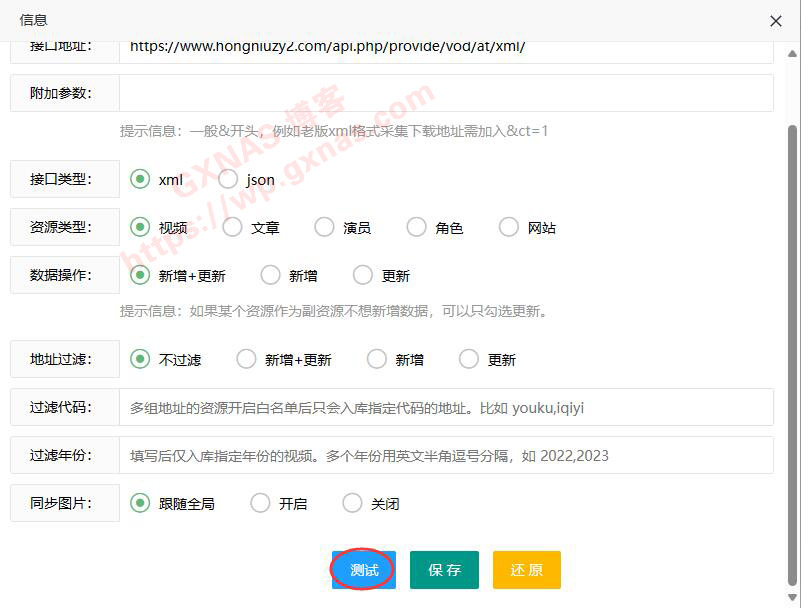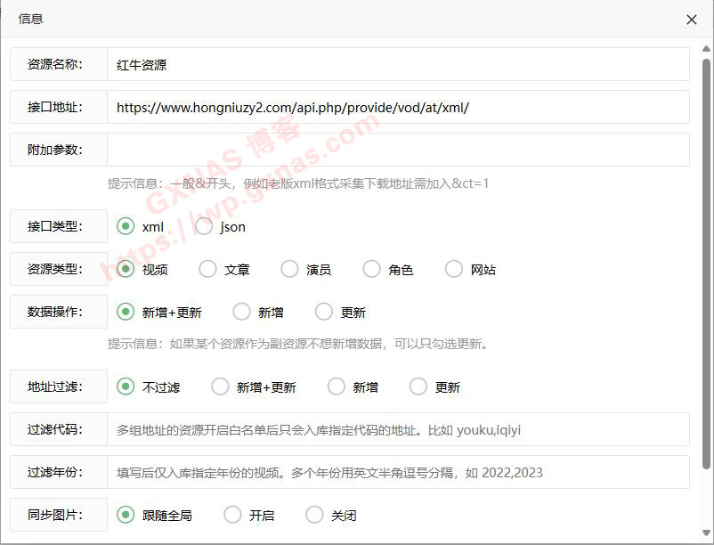 2、本教程以采集“红牛资源”为例,按照下图填写,如果你有自己的采集接口可以自行填写;