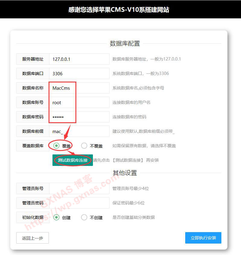 25、数据库名称写MacCms,数据库账号写root,数据库密码为第22步设置的密码,覆盖数据库改成“覆盖”,点“测试数据库连接”;