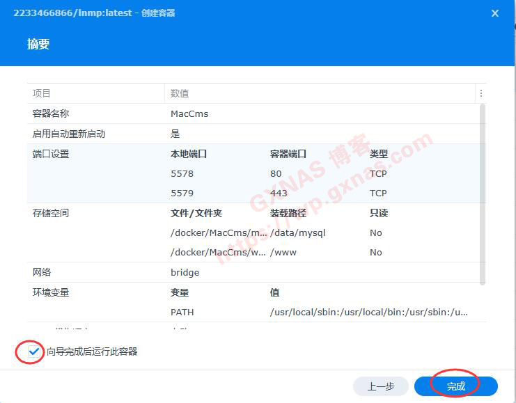 12、【使用docker-compose安装的,跳过此步骤】在“向导完成后运行此容器”处打勾,完成;