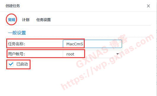 23、在“常规”标签中,设置任务名称,用户账号改为root,在“已启动”处打勾;