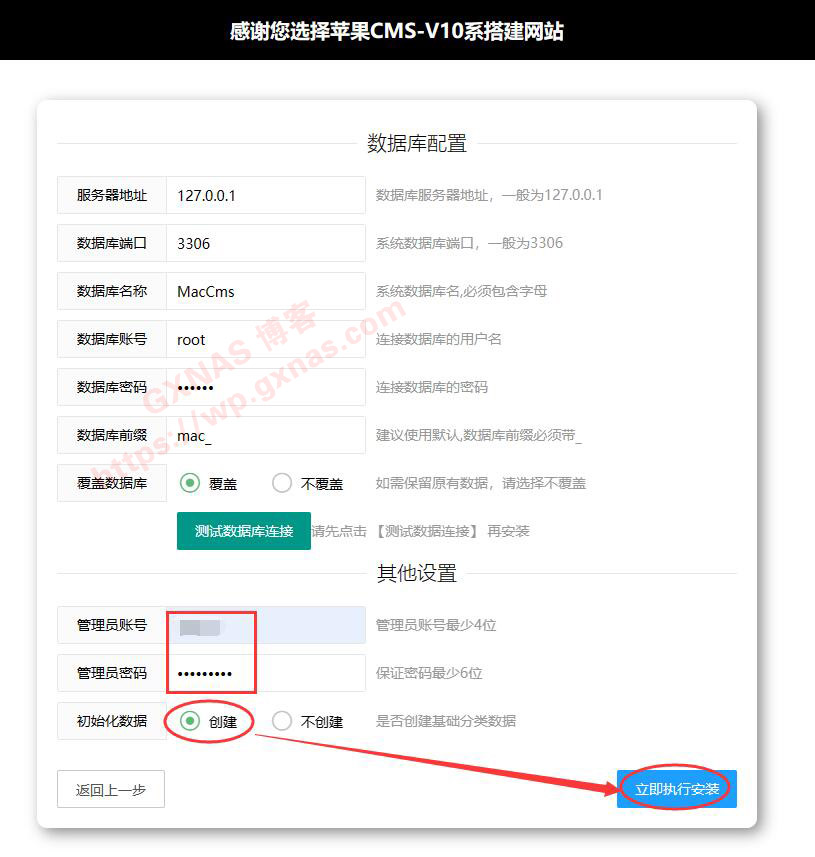 27、自行填写MacCms后台管理员账号和密码,在“初始化数据”选择“创建”,点“立即执行安装”;