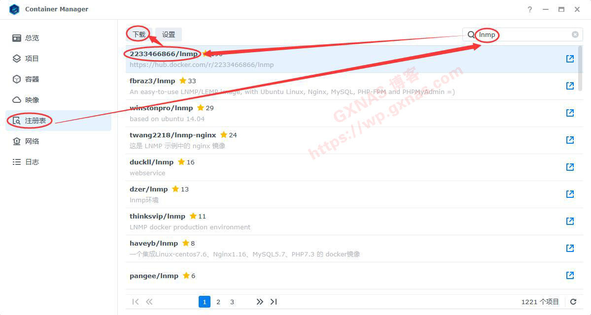 5、【使用docker-compose安装的,跳过此步骤】打开Container Manager套件(Docker套件),在“注册表”搜索“lnmp”,选中“2233466866/lnmp”下载;