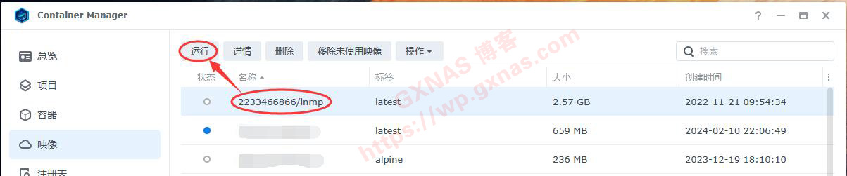 7、【使用docker-compose安装的,跳过此步骤】等下载完成后,在“映像”菜单选中“2233466866/lnmp”,运行;