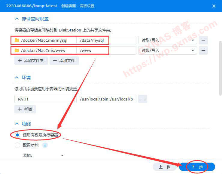 11、【使用docker-compose安装的,跳过此步骤】把第3个步骤建立的mysql和www两个子文件夹,分别映射到容器的/data/mysql和/www这两个路径(权限为读取/定入),映射路径不可以改,改用“使用高权限执行容器”,下一步;