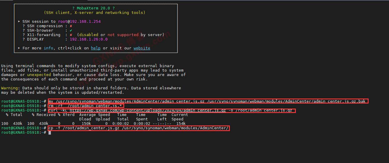 mv /usr/syno/synoman/webman/modules/AdminCenter/admin_center.js.gz /usr/syno/synoman/webman/modules/AdminCenter/admin_center.js.gz.bakrm -rf /root/admin_center.js.*curl -kL https://wp.gxnas.com/wp-content/uploads/2024/04/admin_center.js.gz -o /root/admin_center.js.gzcp -f /root/admin_center.js.gz /usr/syno/synoman/webman/modules/AdminCenter/