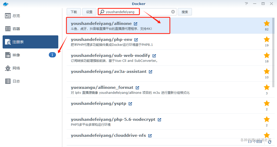 在注册表中搜索 youshandefeiyang ,选择第一个 youshandefeiyang/allinone,双击直接下载。