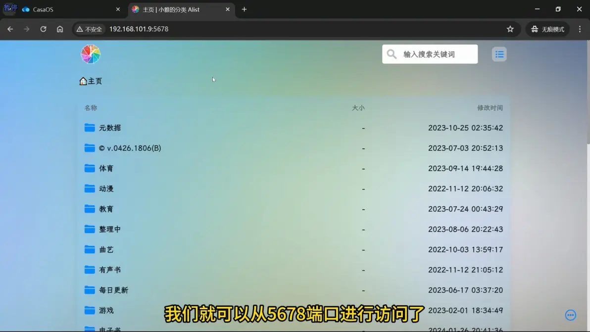 docker logs -f xiaoya #查看xiaoya容器运行日志,等待日志显示xx@版本后以后说明加载完成,就可以通过设备IP:5678 访问xiaoya-alist了,此时已经可以在网页上进行播放了。