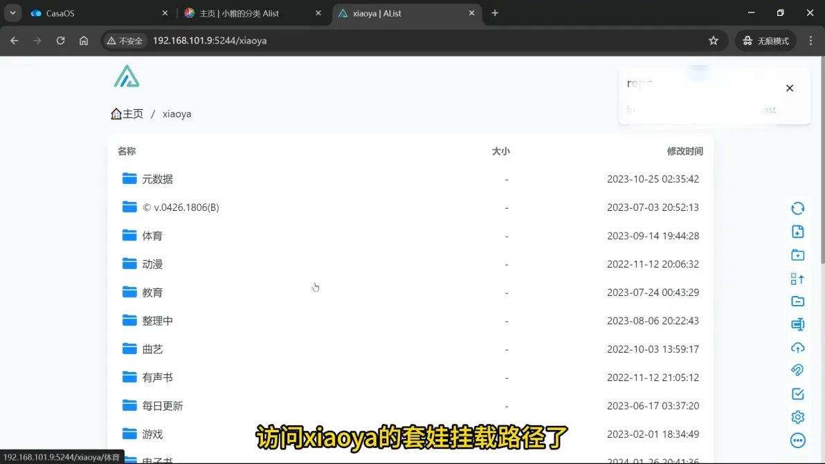 7、在CasaOS中,使用Appstore中安装alist,并根据视频操作完成xiaoya的套娃挂载。