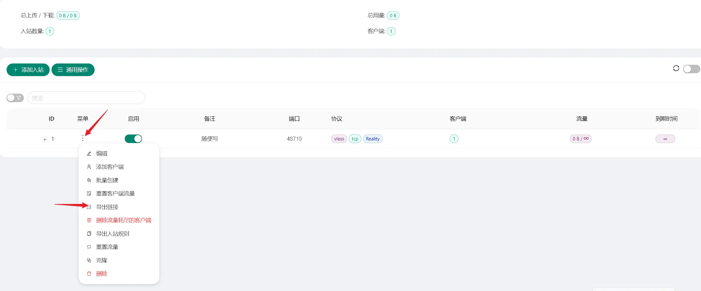 在入站列表栏目里面,上面是显示流量和用户等信息,下方是节点信息。可以看到我们已经搭建好了一个节点,节点的类型是vless tcp Reality这三个标签,关于如何导出节点链接,可以点击节点前方的三个点,然后点击导出链接,然后点击复制即可。