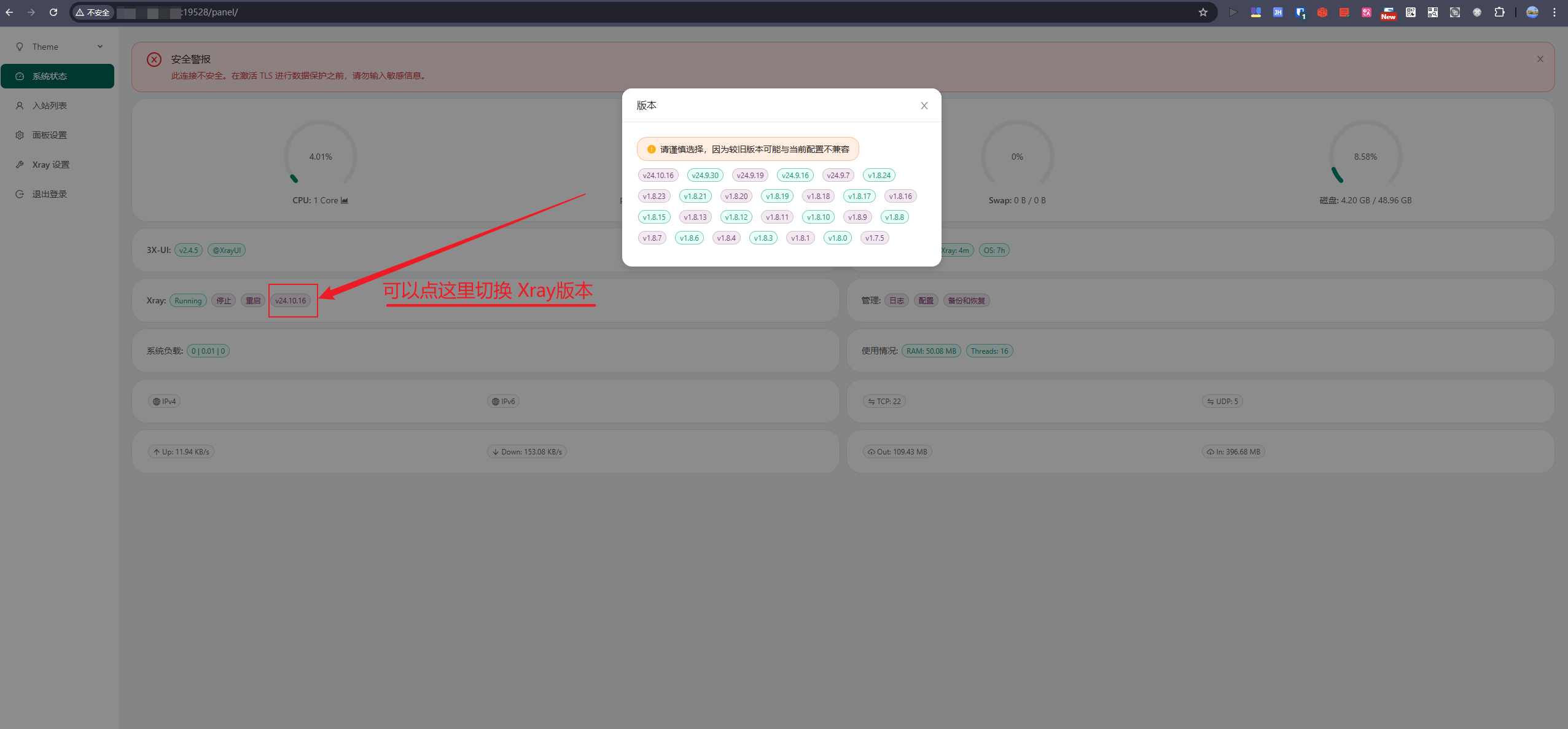 这里不用管,后续到了配置代理的时候在选择。主界面会显示一些信息:x-ui版本/IP地址/xray版本切换/瞬时网络流量/总共用了多少流量/连接数等等,方便查看。