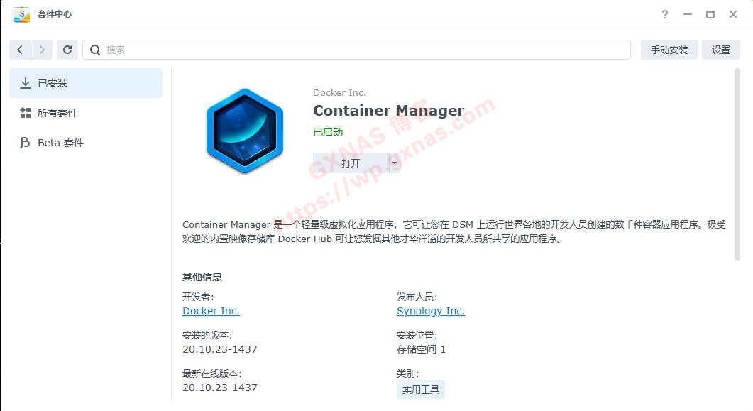 1、套件中心先安装好Container Manager套件(DSM7.2以下该套件名称是Docker)并启用该套件;