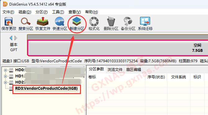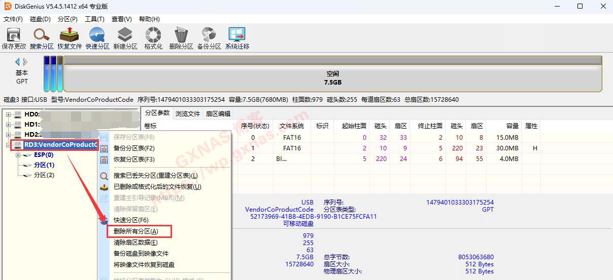 3、准备一个U盘(容量大于等于4G、建议使用金士顿或者闪迪品牌,不要用杂牌)插到Win电脑上,打开Diskgenius,找到U盘右键,删除所有分区;
