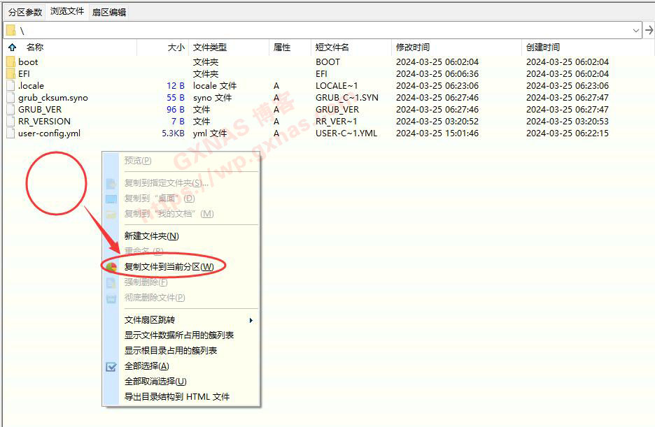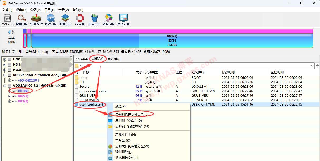 13、先点左边U盘的第一个分区“RR1(0)”,再点右边“浏览文件”,找到user-config.yml文件(DSM5.2的系统找isolinux.cfg,DSM6.X的系统找/boot/grub/grub.cfg),右键,复制到指定文件夹;