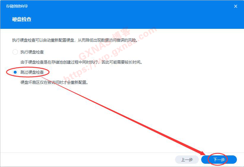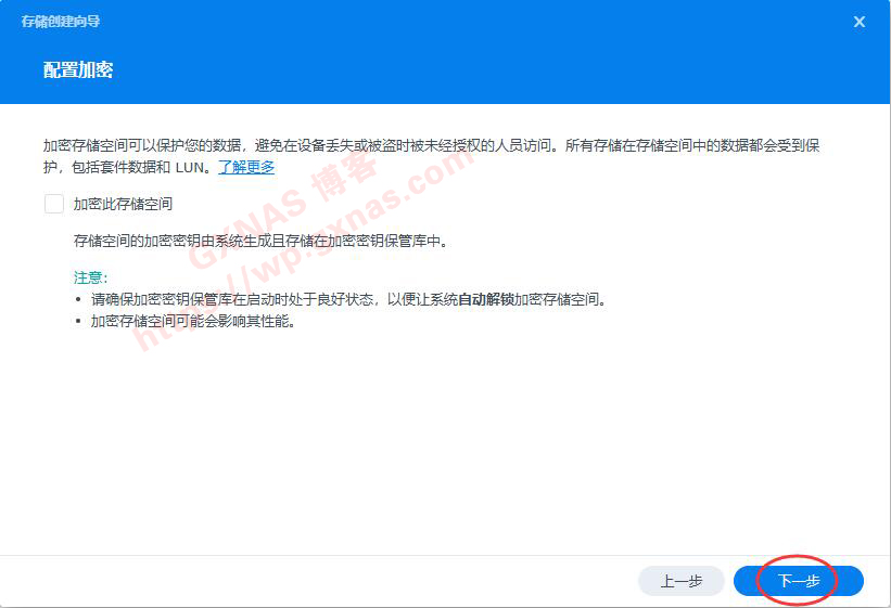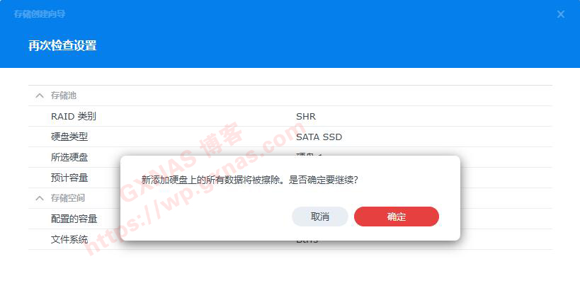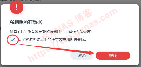 8、由于我使用的硬盘是空的所以会现在这个提示(如果你使用的硬盘是之前群晖在正常使用的,则不显示这个画面),在“我了解这些硬盘上的所有数据都将被删除”处打勾,点“继续”;