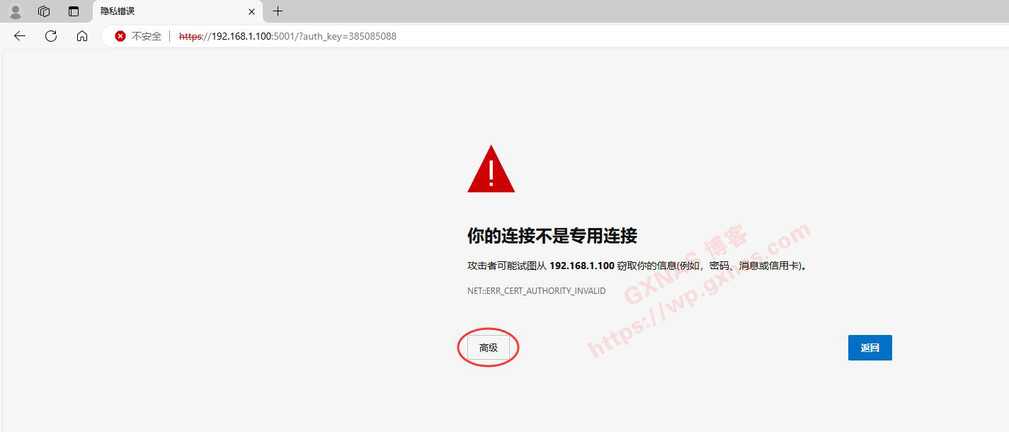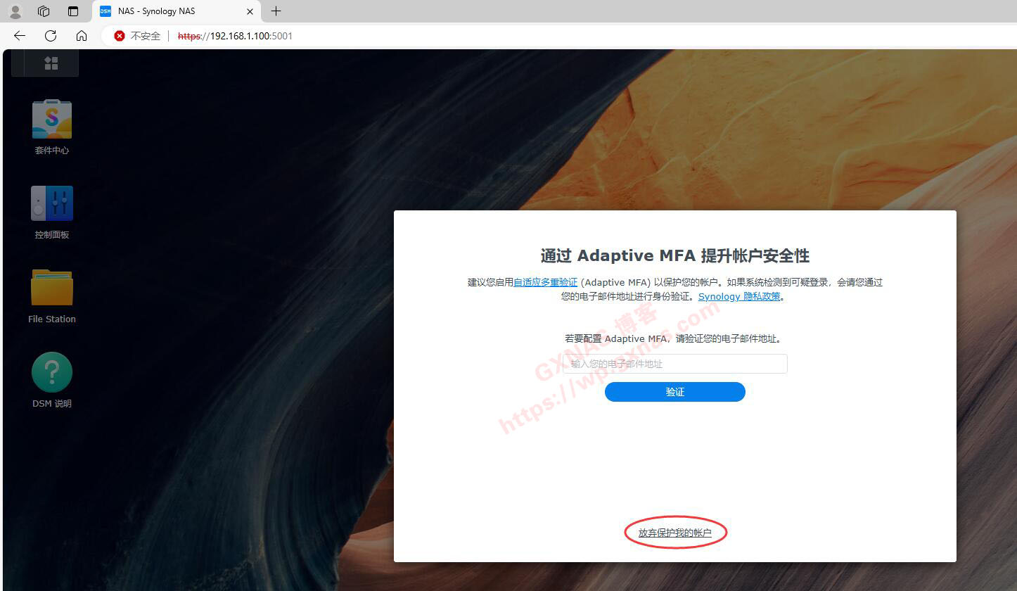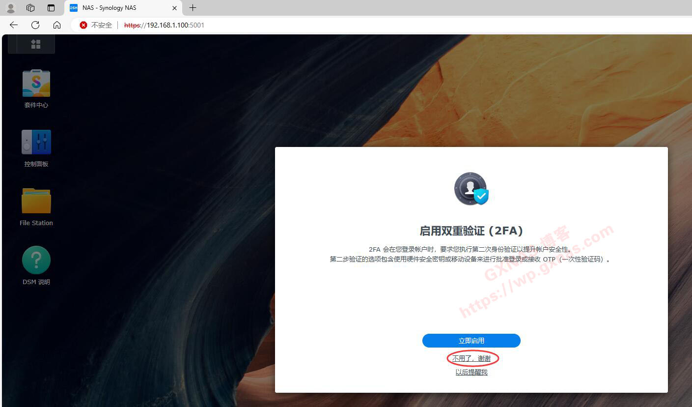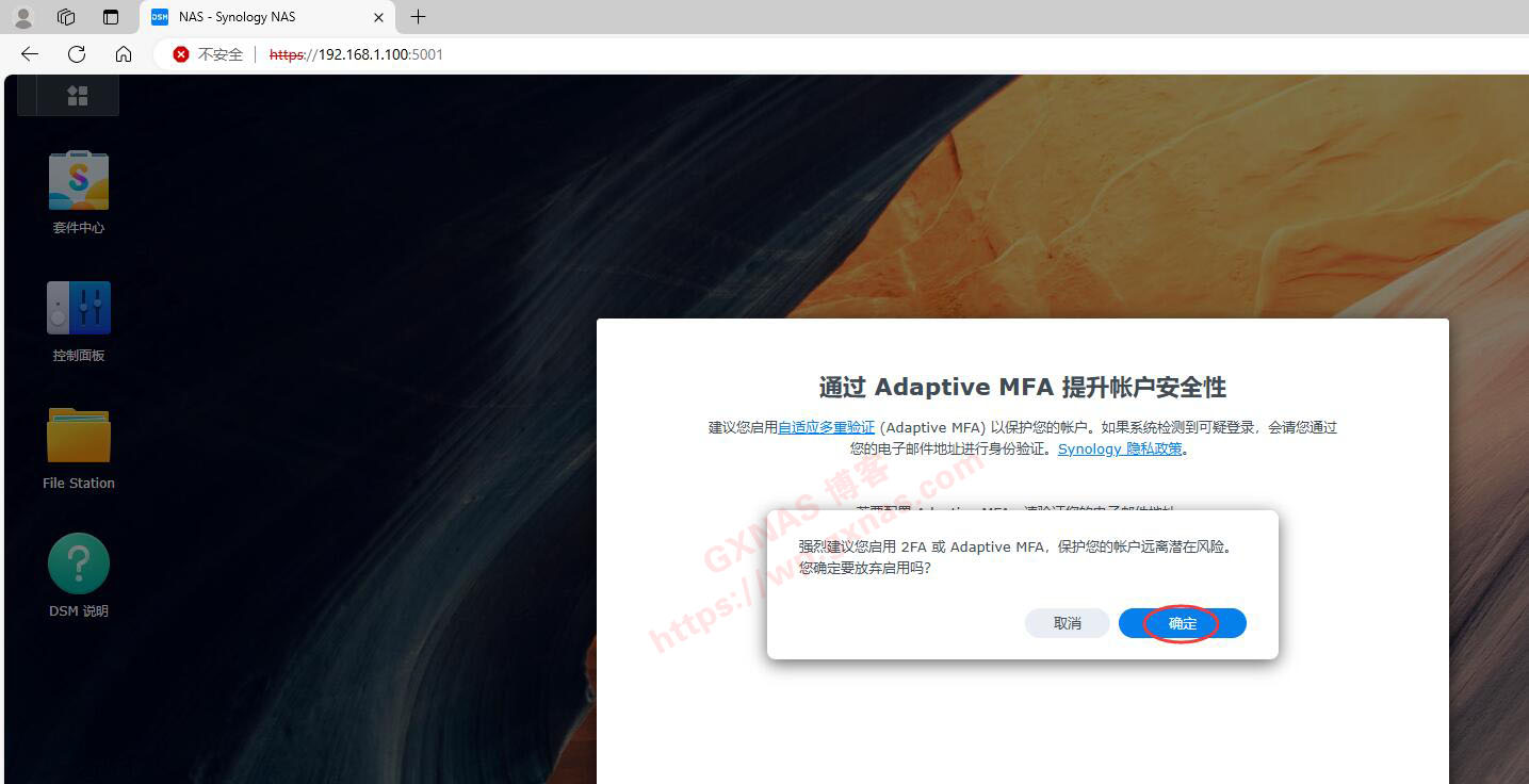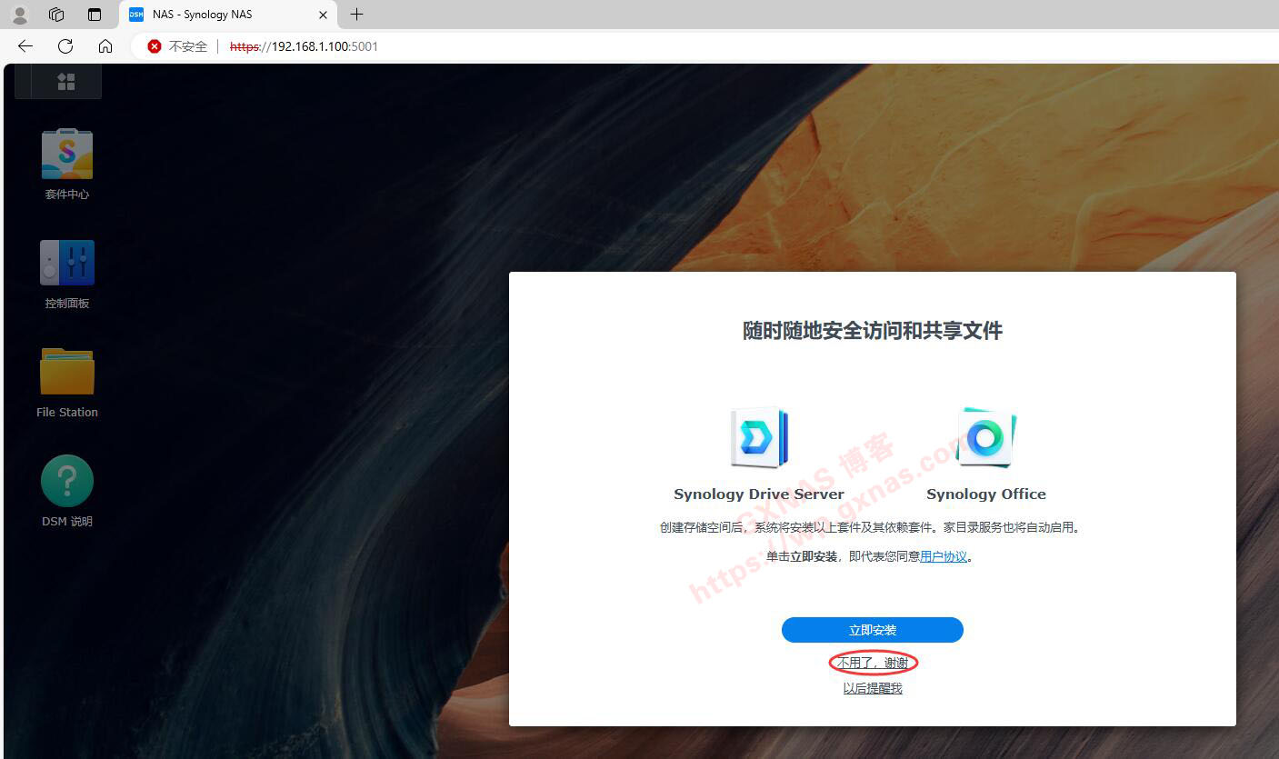 17、DSM7.2X系统默认使用https://ip:5001的格式登录,由于没有域名ssl证书,所以有些浏览器会提示不是专用链接,这属于正常现象,不影响系统使用,点“高级”;