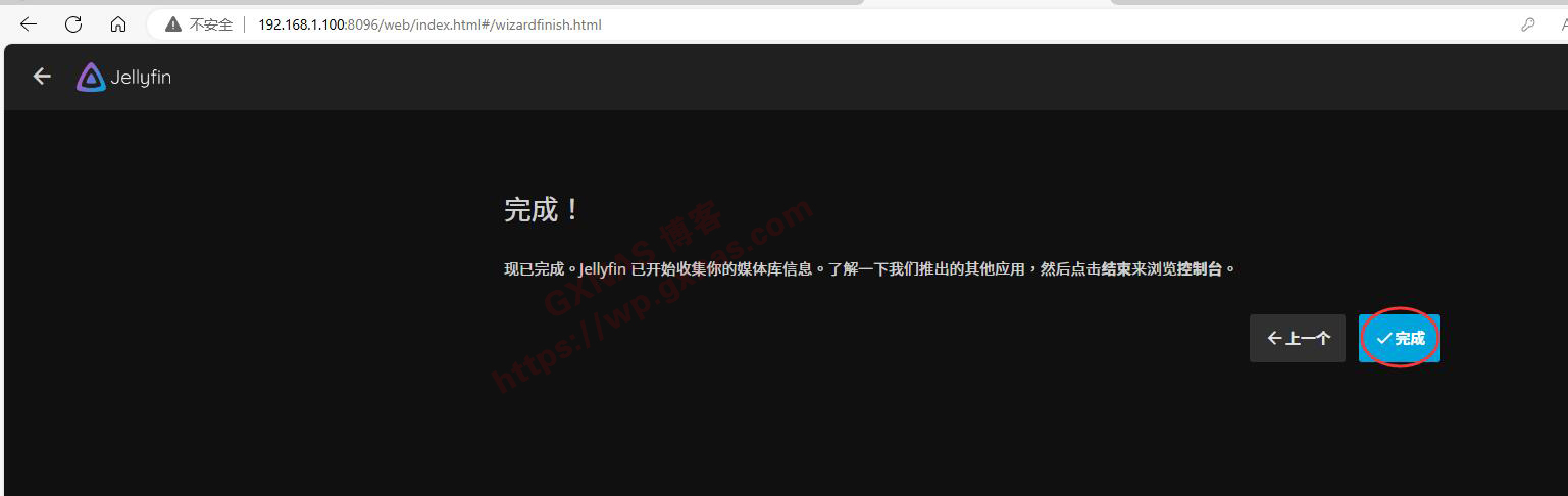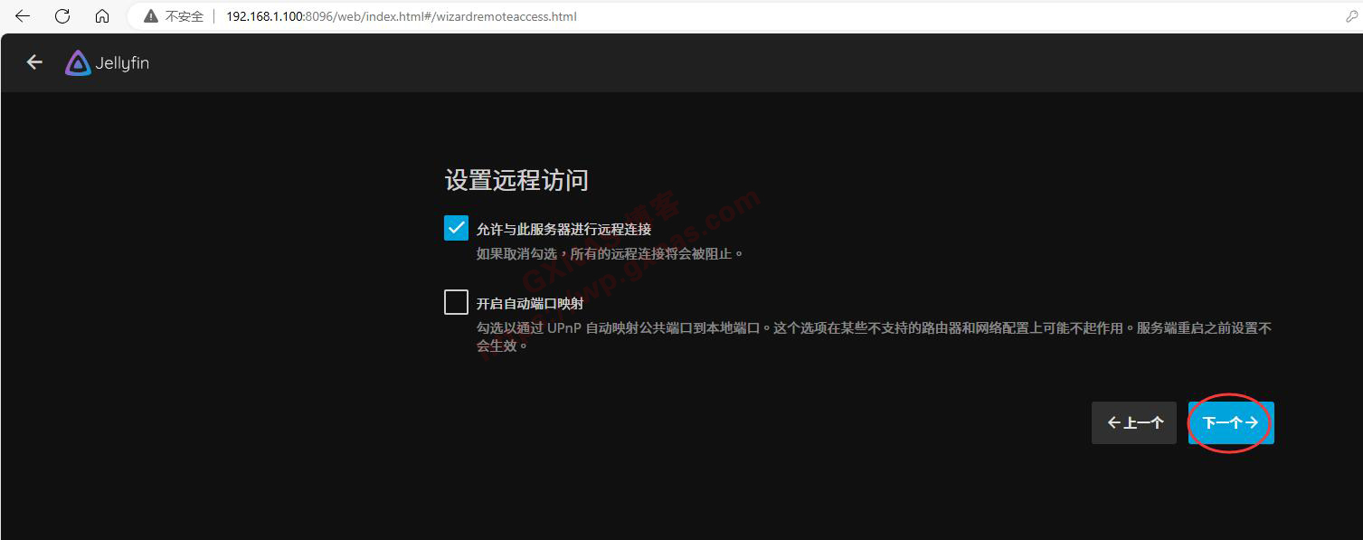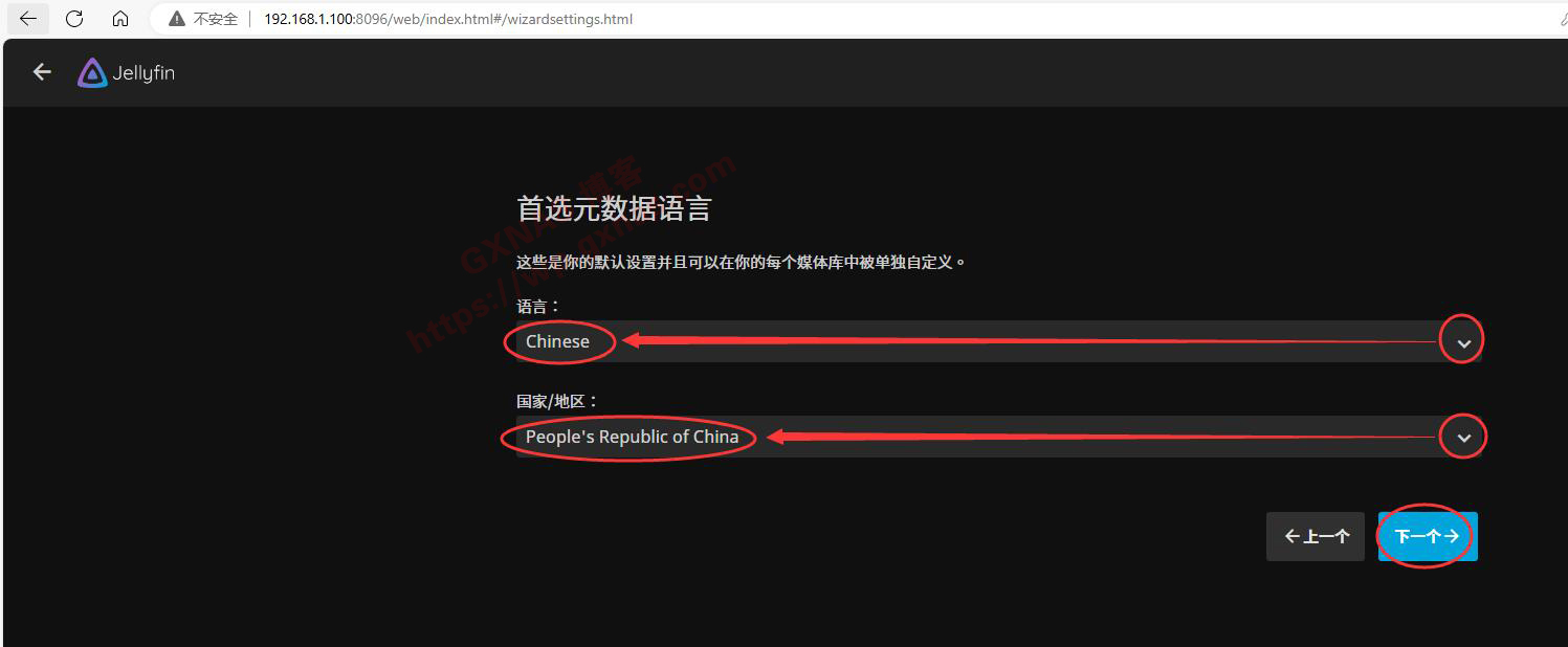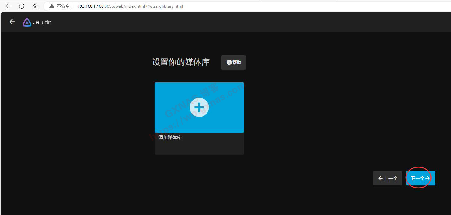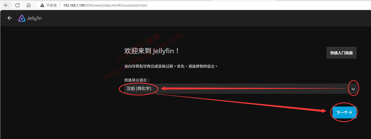 14、Jellyfin默认的http端口是8096,所以在浏览器打开http://群晖的IP地址:8096,会看到欢迎界面,在首选显示语言的下拉列表中选择汉语,下一步;