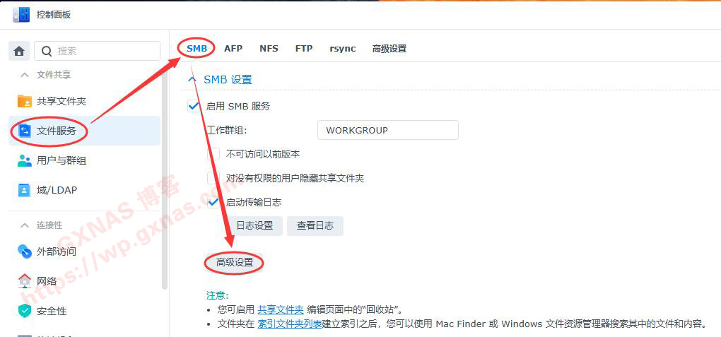 2、如果有电视盒子、摄像头等物联网设备需要使用NAS做SMB共享的,需要进行此步骤的设置,在群晖控制面板,文件服务,SMB,高级设置(如果没有这方面的需求,此步骤不用设置);