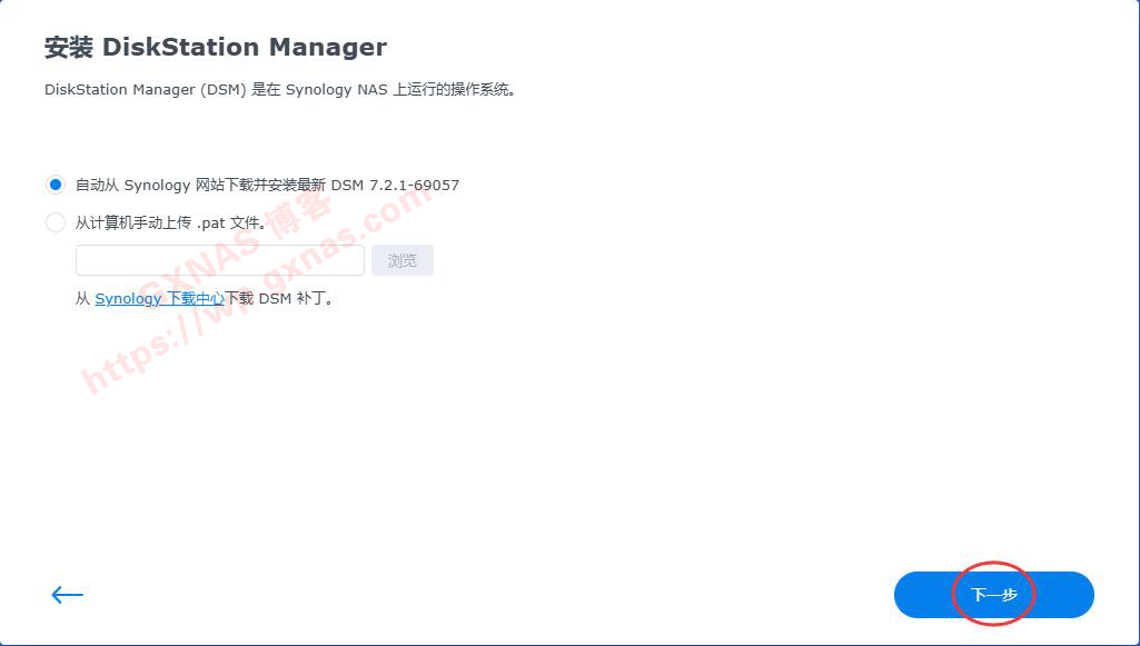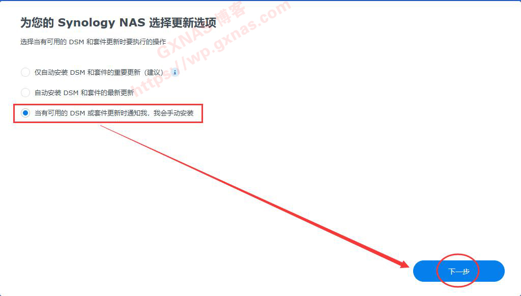 14、选择“当有可用的DSM或套件更新时通知我,我会手动安装”,下一步;