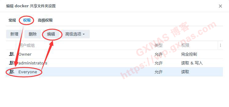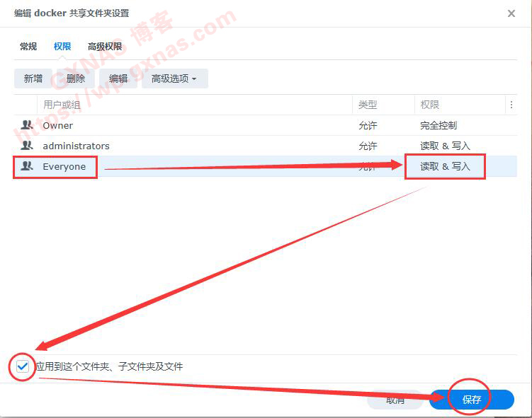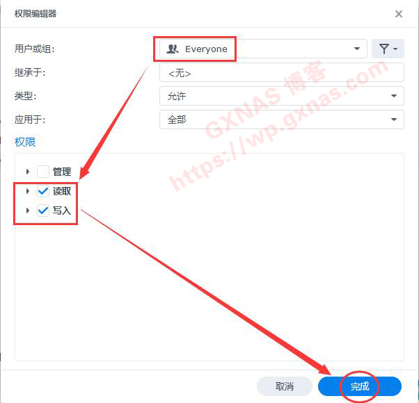 4、确认是“Everyone”用户组,在下方的权限处,勾选“读取”和“写入”,完成;