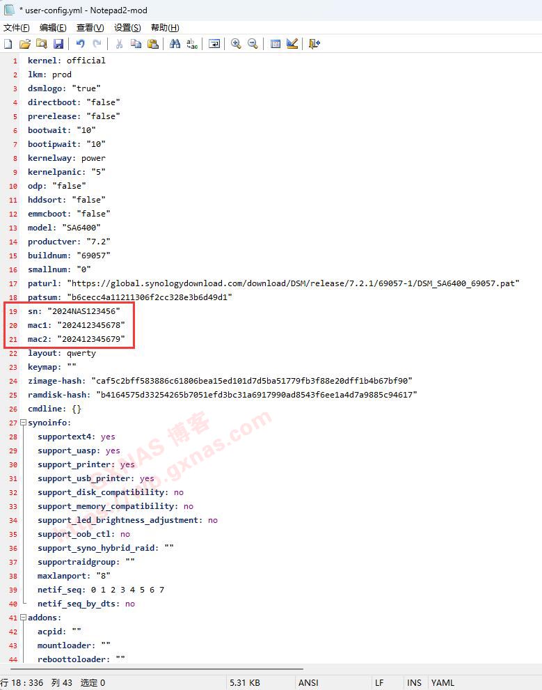 19、user-config.yml文件的第19、20、21行,是填写洗白码sn和mac的地方,本教程此处不做修改,如果你有该型号洗白码的话可以根据实际情况进行修改,user-config.yml修改完成点菜单上保存文件;