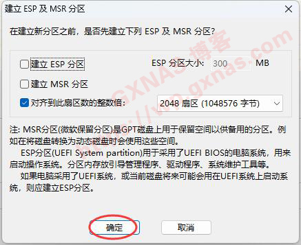 6、“建立ESP分区”和“建立MSR分区”这两个地方不打勾,确定;