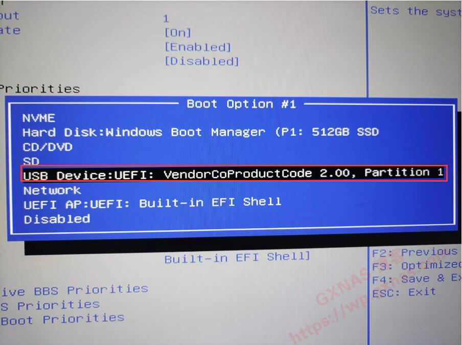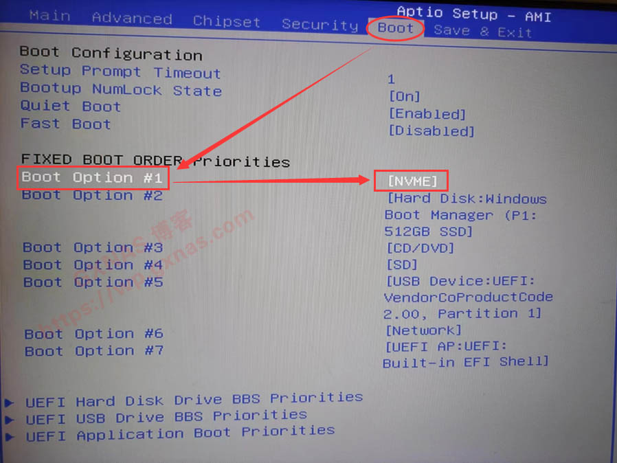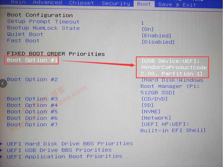 1、要安装NAS的主机装好硬盘,接上键盘,电源线,网线,然后把刷写好引导的U盘插到要安装NAS的主机上(引导U盘需要长期插在NAS主机,不可以拨出),开机后按Del进入BIOS界面,进入Boot菜单,找到“Boot Option #1”这行,看到启动顺序并非是U盘,所以需要按一次回车键;