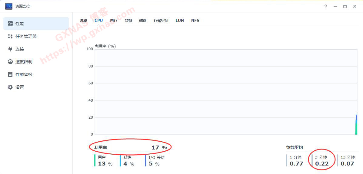 18、打开群晖的资源监控,查看CPU占用情况:当前CPU利用率为17%,5分钟内CPU最高占用才22%,证明Jellyfin在使用GPU转码工作中,减少了CPU的压力;
