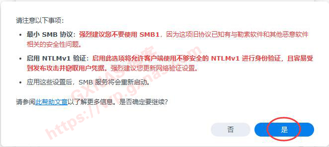 5、(如果没有物联网设备需要使用NAS做SMB共享的需求,此步骤不用设置)是;