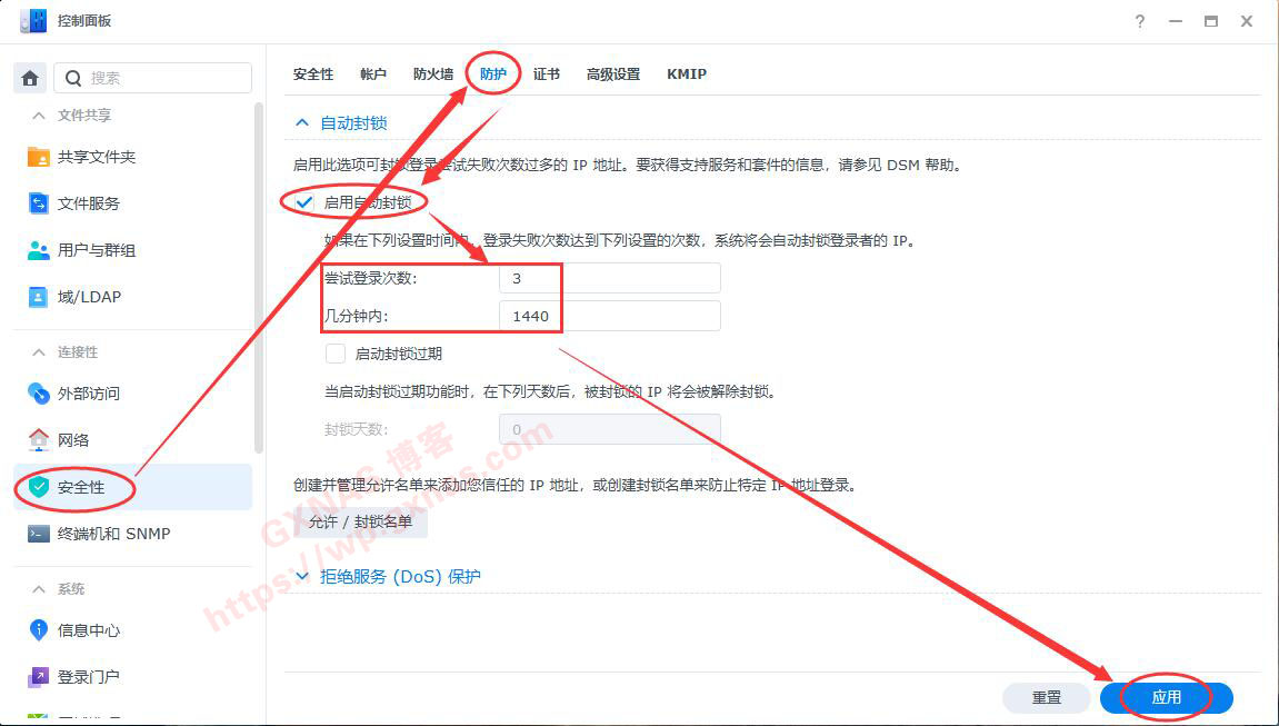 8、(强烈要求设置)群晖控制面板,安全性,防护,启用自动封锁,下图设置是24小时内登录失败3次就封锁该IP地址(如果自己操作失误造成IP被锁的,可以更换电脑的IP登录到此处,在下方的“允许/封锁名单”里面把被锁的IP删除);