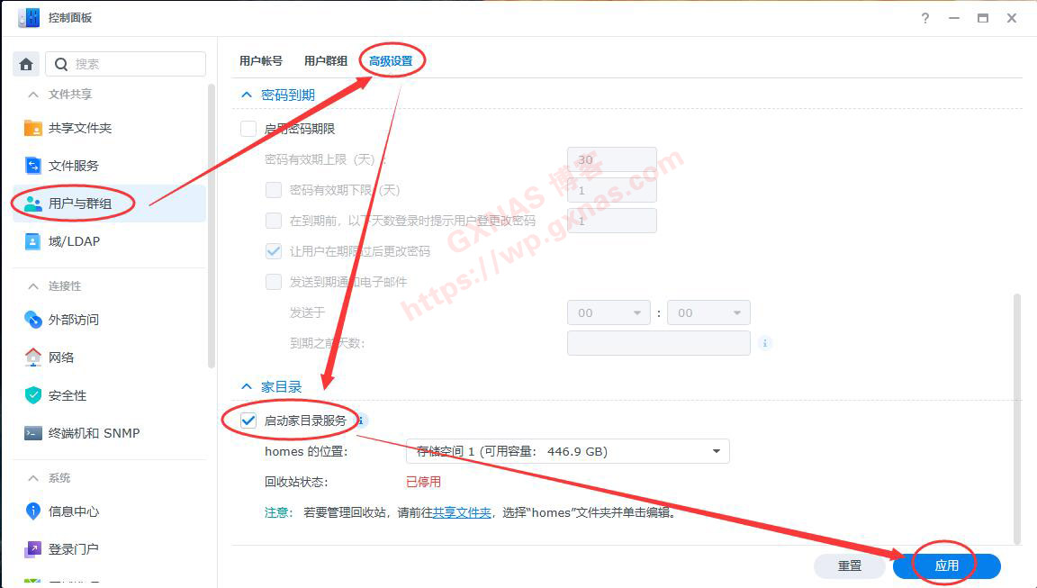 1、(需要使用Photos和DRIVE的必须设置)在群晖控制面板,用户与群组,高级设置,拉到最下面,在“启动家目录服务”处打勾(如果你建立有多个存储空间的,请根据实际情况选择存储空间),应用;