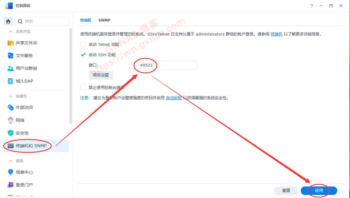 7、(强烈要求设置)群晖控制面板,终端机和SNMP,启动SSH功能,端口号默认为22,请改成5位数字不常用的端口号(端口范围从10000到65535之间,不能跟DSM端口一样),设置完成点右下角“应用”保存;