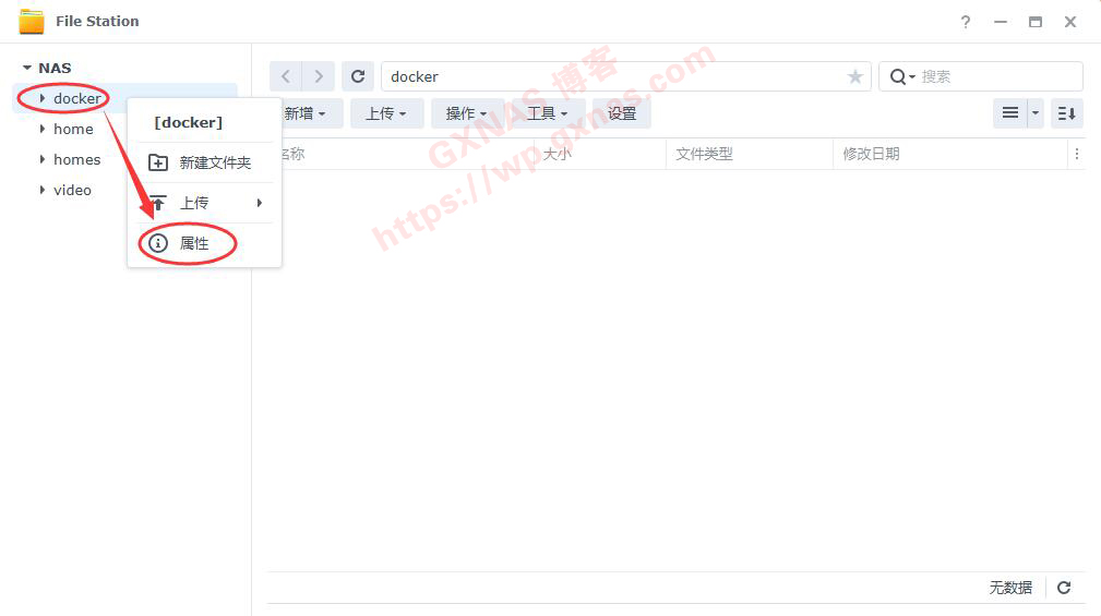 2、打开群晖File  Station,在左边docker文件夹右键,属性;