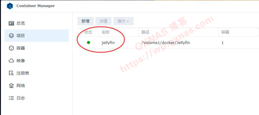 13、看到Jellyfin项目状态为绿色的时候,表示该项目正常运行中;