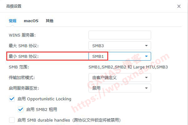 3、(如果没有物联网设备需要使用NAS做SMB共享的需求,此步骤不用设置)在“常规"标签中,把最小SMB协议改为SMB1;