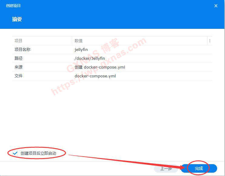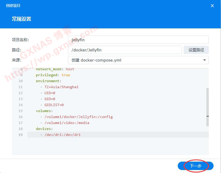 9、填写项目名称jellyfin,路径选择在docker文件夹下的Jellyfin子文件夹,来源选择“创建docker-compose.yml”,把下方的代码中/volume1/docker/Jellyfin和/volume1/video根据实际情况修改成你的实际路径,然后复制代码粘贴到“来源”的里面,下一步;