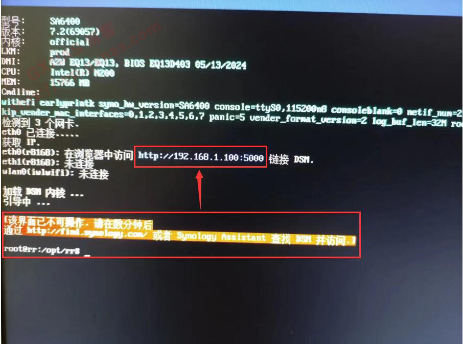 5、耐心等待引导盘启动,启动完成会显示“该界面已不可操作”等等的提示以及IP地址和端口号(路由器需要开启DHCP),如下图;