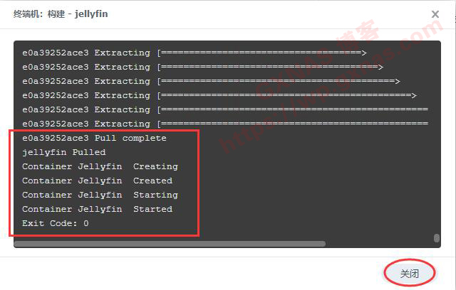 12、系统开始自动接取Docker容器安装,当出现下面完成提示的时候,点“关闭”,如果容器拉取失败,请按照【本教程】解决;